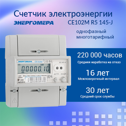 Счетчик электроэнергии CE102M R5 145-J однофазный многотарифный 5(60) класс точности 1.0 D ЖКИ оптопорт